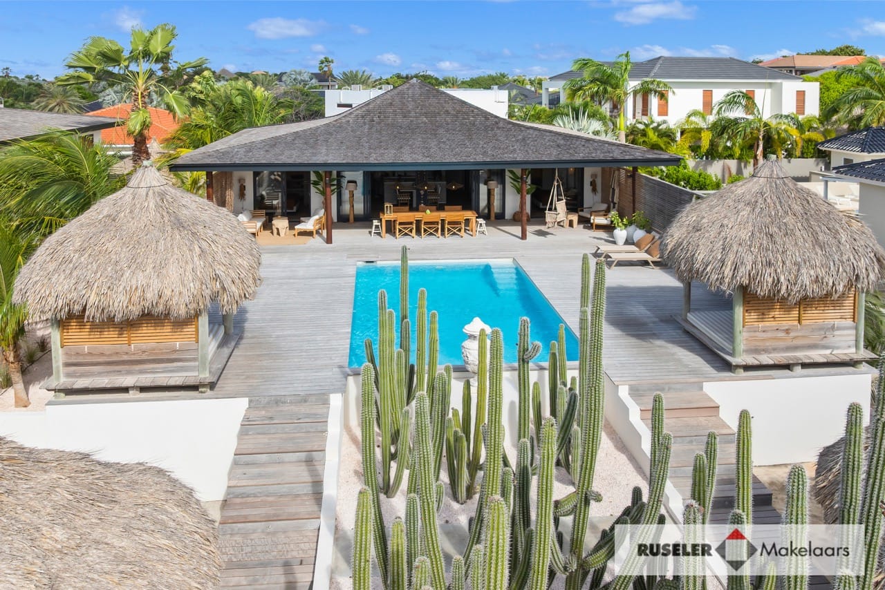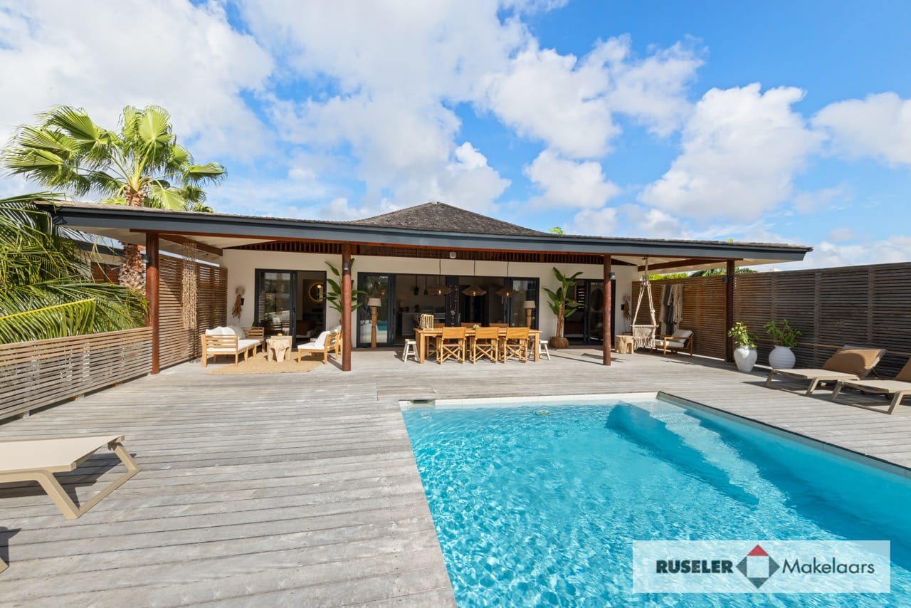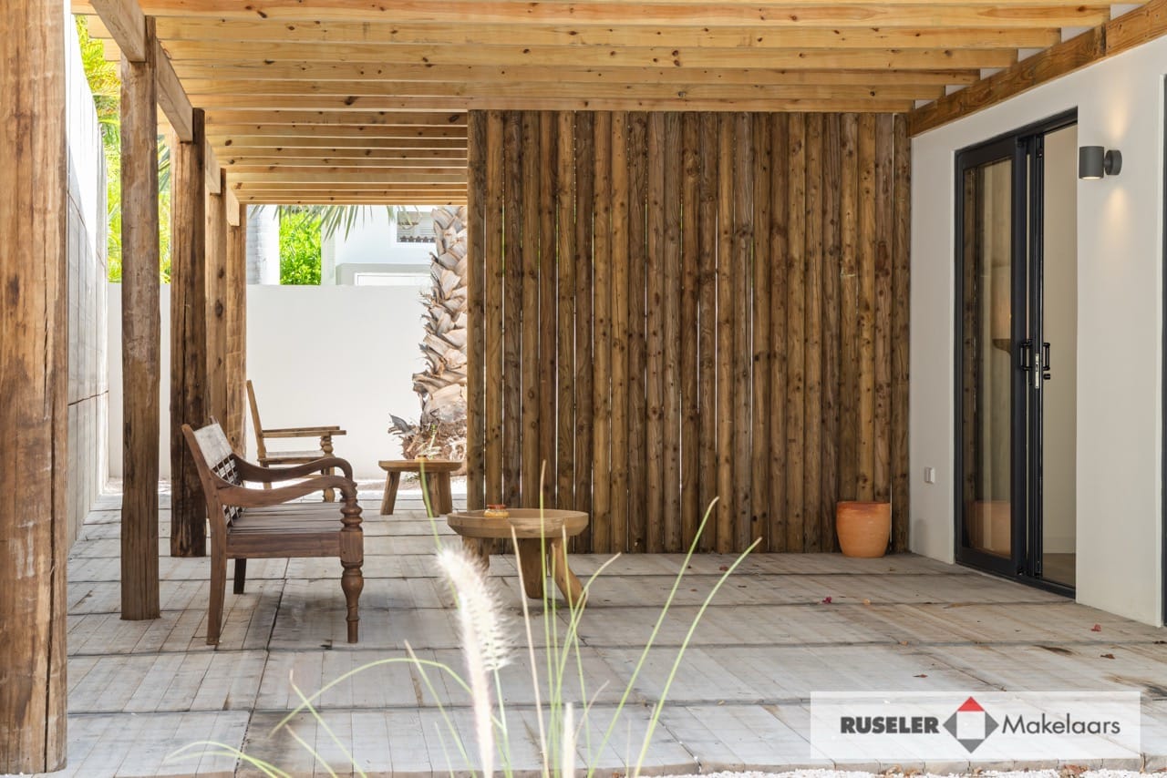 Buiten geniet je van het beste van tropisch buitenleven: een houten pooldeck, zwembad, overdekte porch en twee gezellige cazebos aan het zwembad. Perfect om te chillen in de schaduw of ontspannen in de zon.