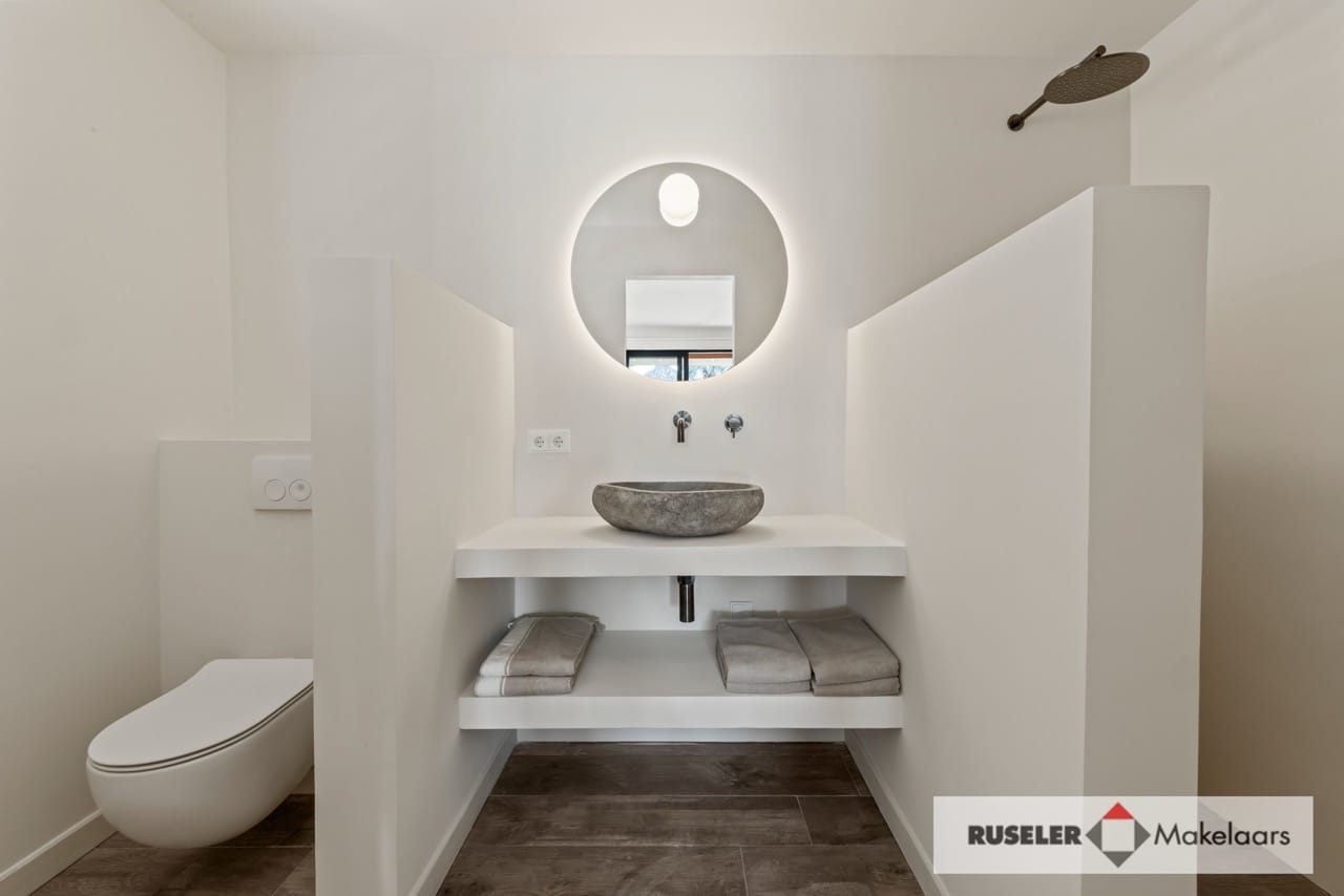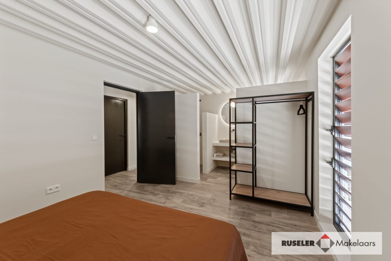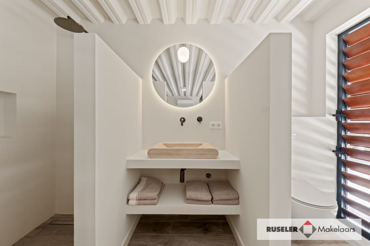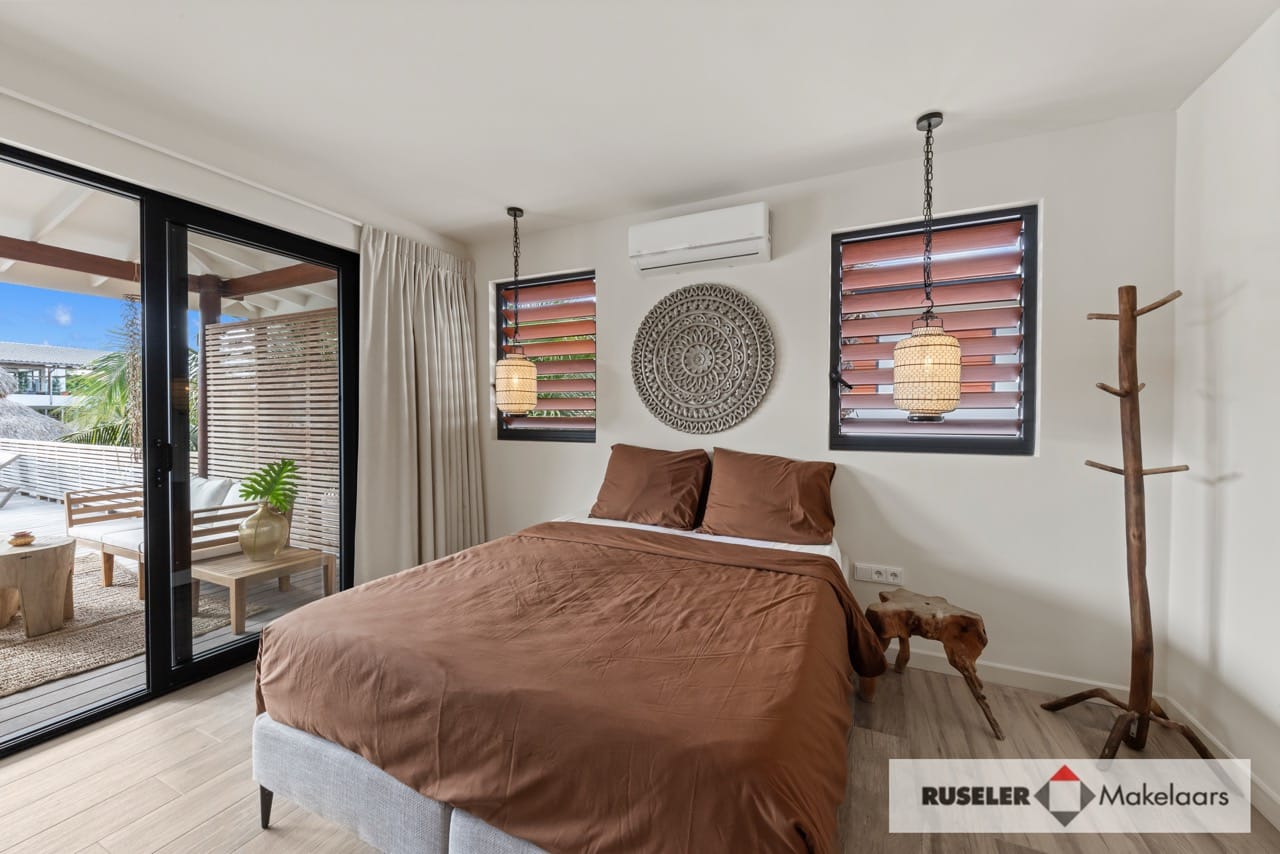 De bovenverdieping is ingericht rondom een ruime woonkeuken met kookeiland, voorzien van luxe apparatuur zoals een Amerikaanse koelkast, inductiekookplaat, oven en vaatwasser. Daaromheen liggen vier slaapkamers, elk met ensuite badkamer en airconditioning, comfort tot in de puntjes.